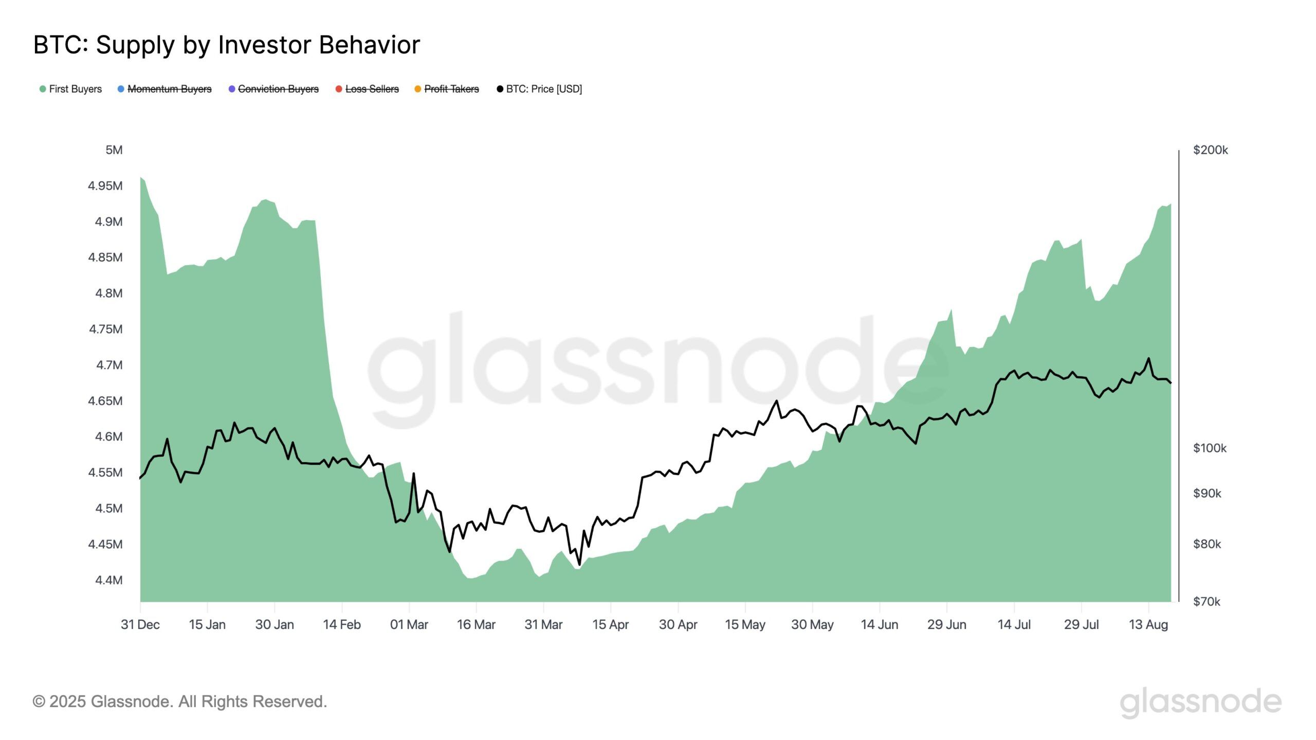 Glassnode, блокчейн деректері мен интеллект платформасы, алғаш рет сатып алушылардың қолындағы ұсыныстың 1,0%-ға өскенін хабарлады. Соңғы бес күнде ол 4,88 млн-нан 4,93 млн BTC-ға дейін өсті, бұл жаңа сұранысты көрсетеді.