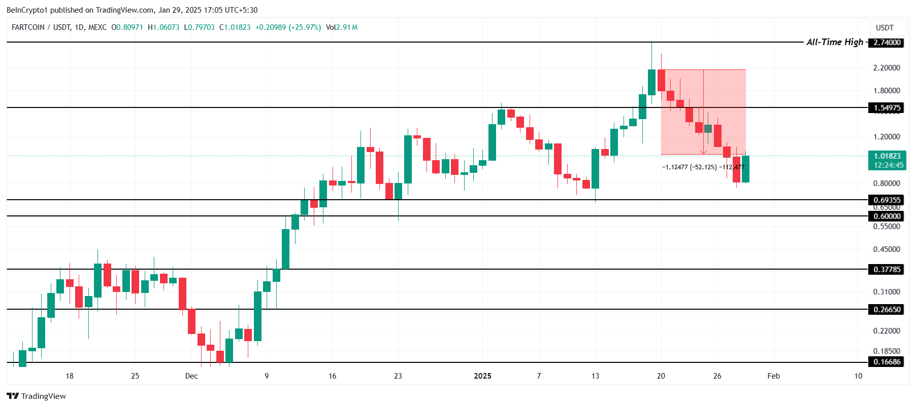 Қатты түзетуге қарамастан, FARTCOIN 0,69 доллар дағдарыстық қолдау деңгейінен жоғары тұр, бұл тарихи тұрғыдан тереңірек төмендеулерді болдырмады. Егер бұл қолдау сақталса, мемкоин 1,54 долларды қолдау ретінде қайтарып алып, 2,74 доллар тарихи максимумға және одан да жоғарыға жетуге тағы бір әрекет жасай алады.