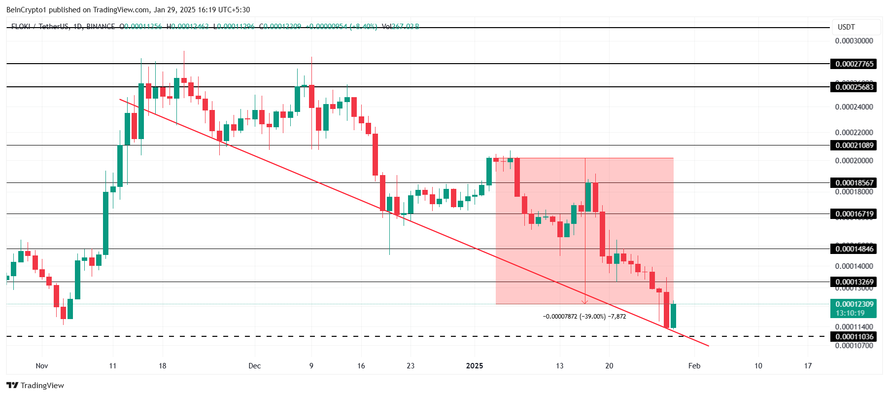 FLOKI PEPE сияқты тұрақты төмендеу трендінде қалып, тренд сызығынан жоғары қалуға тырысуда. Қазіргі уақытта 0,000123 доллар саудалануда, мемкоин соңғы айда шамамен 40% төмендеді.