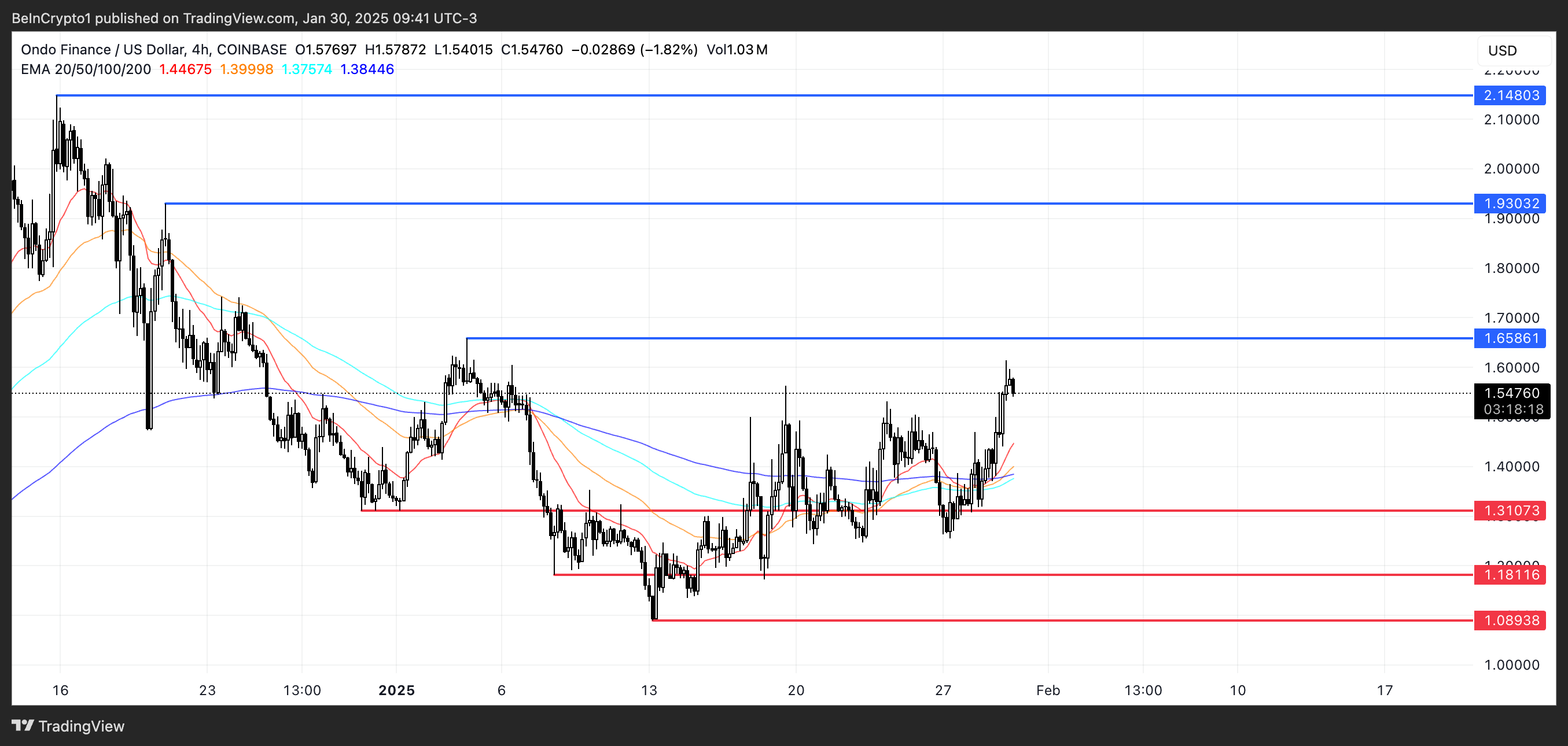 Егер ағымдағы импульс сақталса, ONDO 1,65 доллар кедергі деңгейінен өтуі мүмкін. Бұл деңгейден жоғары қозғалыс бағаны 1,93 долларға дейін итермелеп, 2024 жылдың желтоқсан айының ортасынан бері алғаш рет 2 долларға сынақ жасау мүмкіндігін береді.
