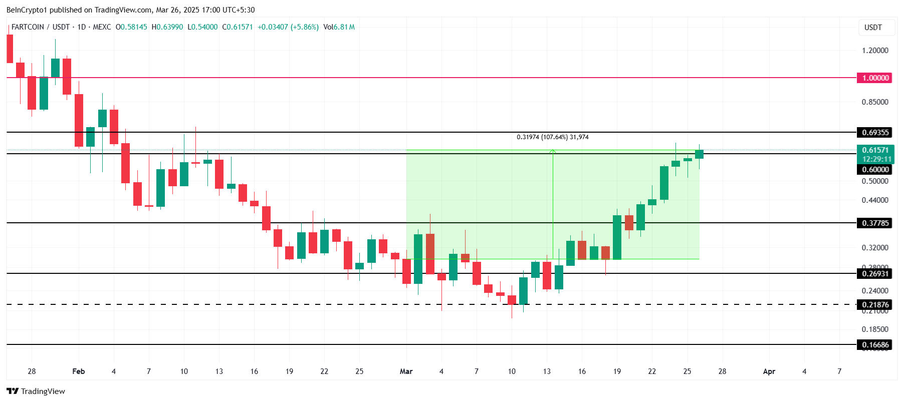 FARTCOIN осы айда ең жақсы нәтиже көрсеткен мемкоиндердің бірі болып шықты, ол 107%-ға өсіп, 0,61 долларға саудаланып жатыр. Бұл әсерлі өсу мемкоинге наурыз және ақпан айларында болған барлық шығындарды қалпына келтіруге мүмкіндік берді.