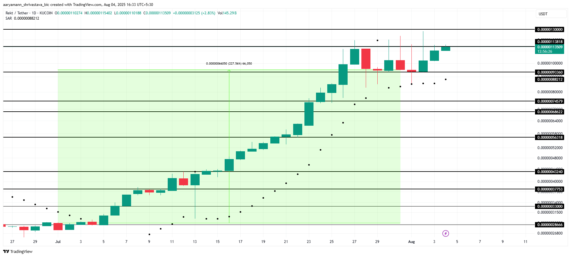 REKT шілде айында әсерлі өсу көрсетті, 221%-ға артты. Қазіргі уақытта альткоин 0,000001155 доллар бағасымен саудаланып, осы айда күшті импульсті сақтап келеді.