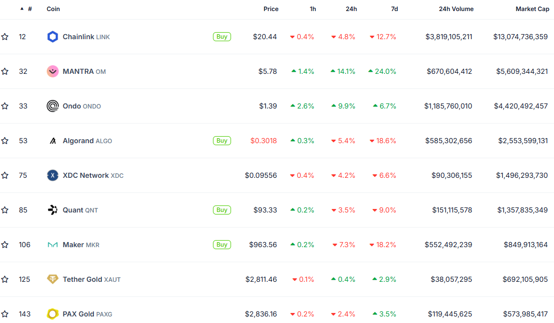 Бұл құлдырауға қарамастан, RWA крипто ішіндегі маңызды активтер класы болып қала береді, қазіргі уақытта нарықтық құны 1 млрд доллардан асатын тоғыз жобаны қамтиды. Chainlink, Avalanche, Hedera, Mantra және Ondo сияқты негізгі ойыншылар сектордың дамуын жалғастыруда.