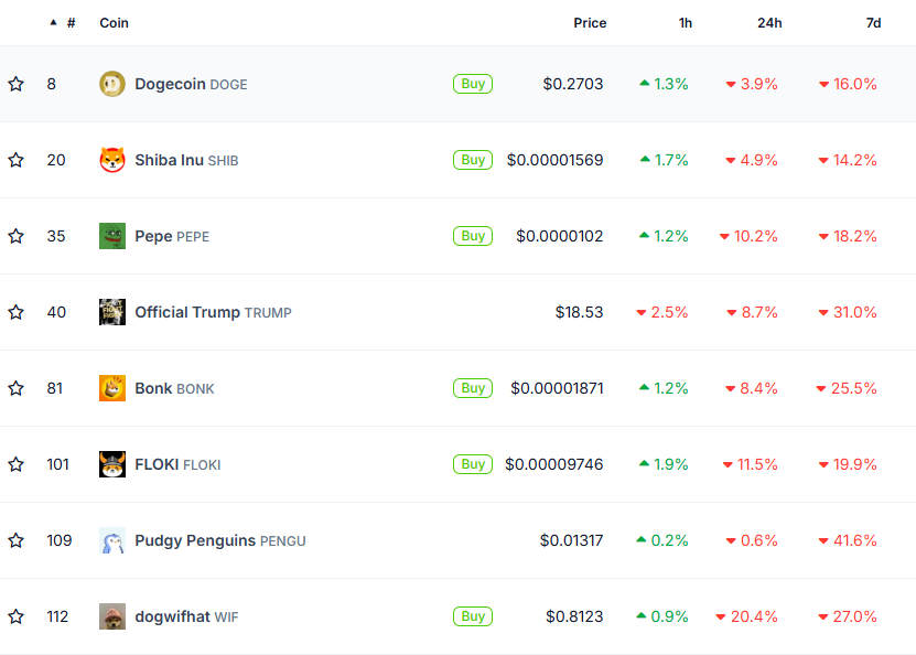 Төмен қатысу және бағалардың төмендеуімен мемкоиндар сатылым қысымына тап болуда. Жаңа катализатор пайда болмаса, олардың нарықтағы үстемдігі әлсіреуі мүмкін.