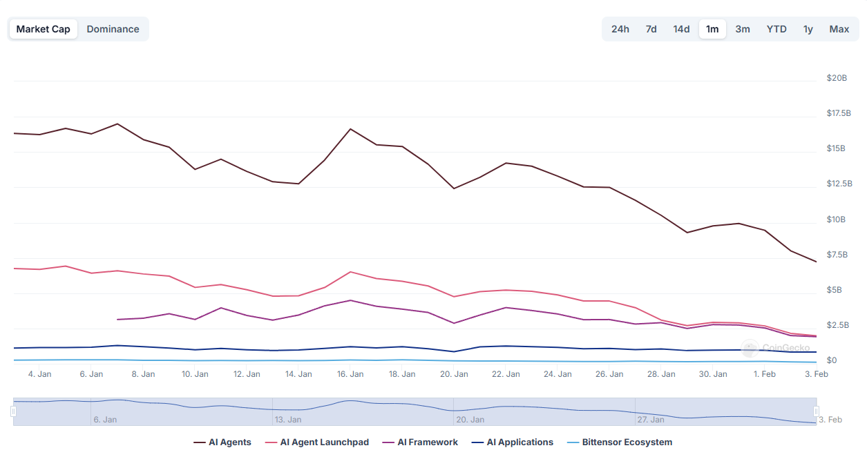 Жасанды интеллект секторы өткен айда крипто нарығында ең көп зардап шеккен аймақтардың бірі болды. 6 қаңтарда 60 млрд долларлық шыңға жеткеннен кейін, ол қазір 32,8 млрд долларға дейін төмендеді, бұл күрт құлдырауды көрсетеді.