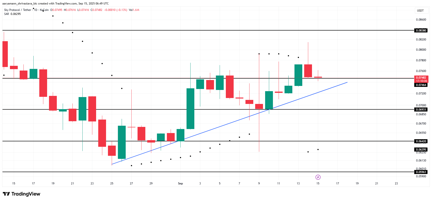 SKY бағасы 0,0748 долларға саудаланып, 0,0746 доллар қолдау деңгейінен жоғары күшін сақтап тұр. Альткоин кеңірек нарықтағы құбылмалылыққа қарамастан үш апта бойы өсу үрдісін сәтті сақтап қалды. Бұл диапазонды сақтау маңызды, себебі ол инвесторлардың сенімін білдіреді және қысқа мерзімді перспективада одан әрі пайда табуға негіз болады.