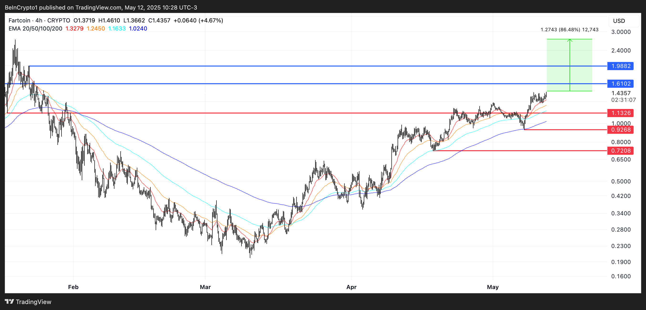 FARTCOIN соңғы екі айда нарықта ерекшеленді, 10 наурыз бен 12 мамыр аралығында шамамен 600%-ға өсті—көптеген альткоиндер құлдырауда болған кезеңде.