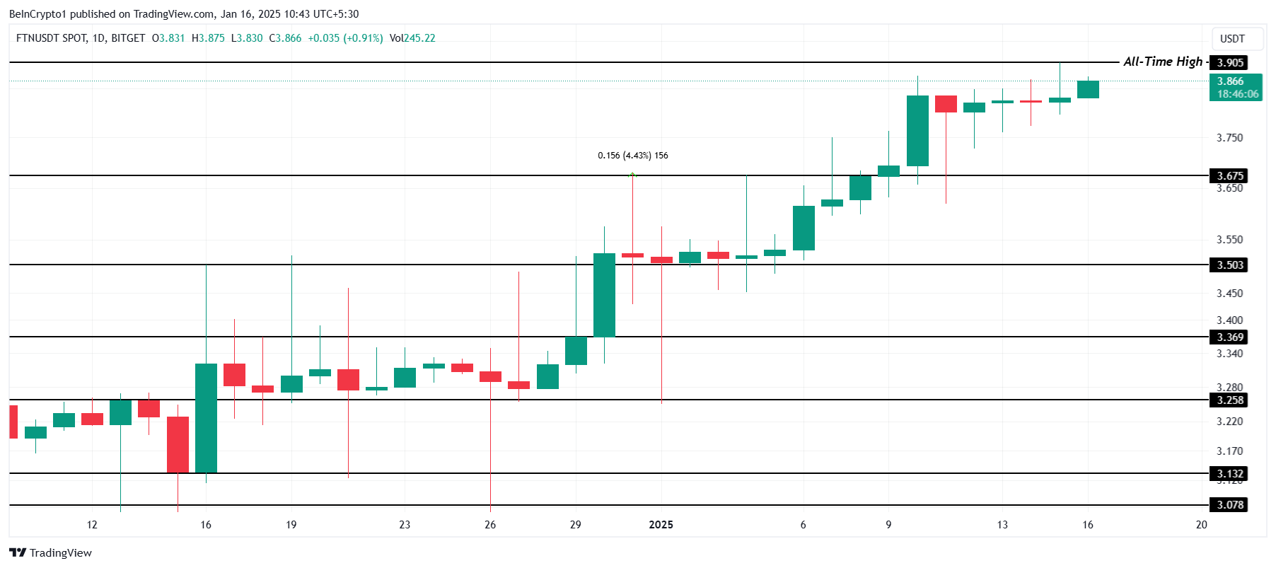 FTN жақында апталық қарапайым табыстарға қарамастан, 3,90 доллар жаңа барлық уақыттағы ең жоғары деңгейге (ATH) жетті. Альткоинның өсу қарқыны күндізгі ең жоғары деңгейлермен қамтамасыз етіледі, бұл тұрақты қызығушылық пен өсу әлеуетін көрсетеді.