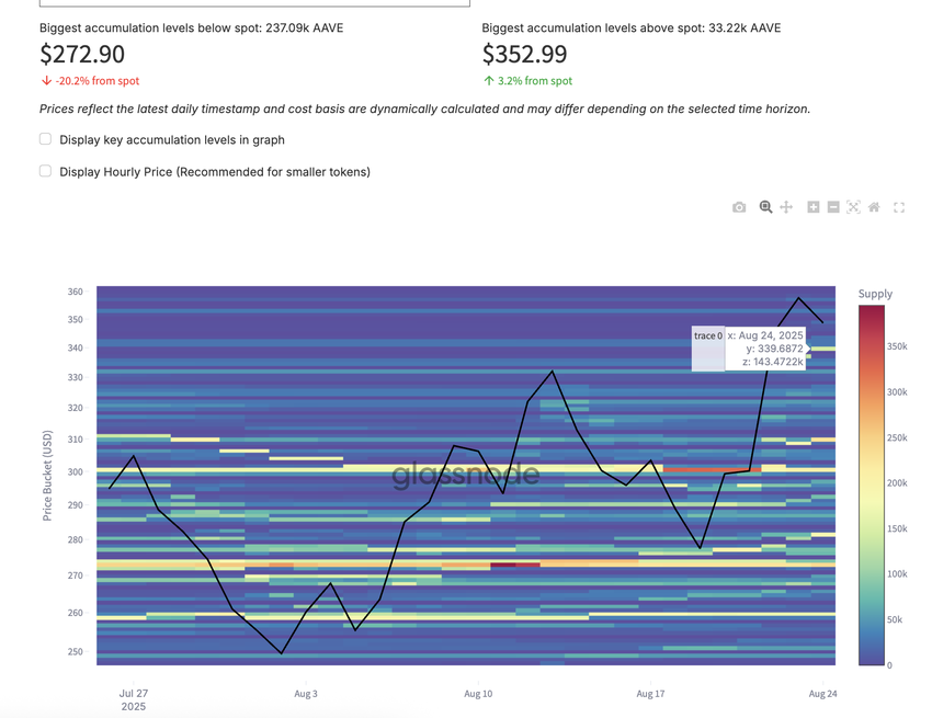 339 долларда шамамен 143 470 AAVE ұсталады. Тағы 135 820 AAVE 337 доллар маңында орналасқан. Бұл кластерлер күшті сұраныс аймақтарын көрсетеді, 339 доллардың бұрылыс нүктесі болғанын растайды. Тағы бір кері қайтару пайда болса да, бұл аймақ қолдау көрсете алады.