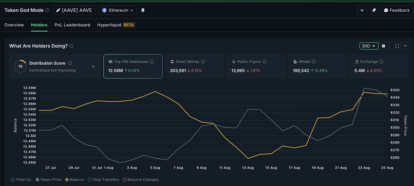 Соңғы 30 күн ішінде AAVE биржа резервтері 4,33%-ға төмендеп, 5,4 млн токенге дейін азайды. Бұл шамамен 244 400 AAVE сауда платформаларынан кеткенін білдіреді. Қазіргі 341 доллар бағасымен бұл шамамен 83,3 млн долларға тең, бұл сату емес, жинақтау белгісі.