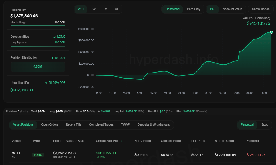 Қызықтысы, Onchain Lens блокчейн аналитикалық фирмасы хабарлағандай, орталықтандырылмаған Hyperliquid биржасында тізімделген WLFI келісімшарттары күшті бұқа импульсін көрсетті.