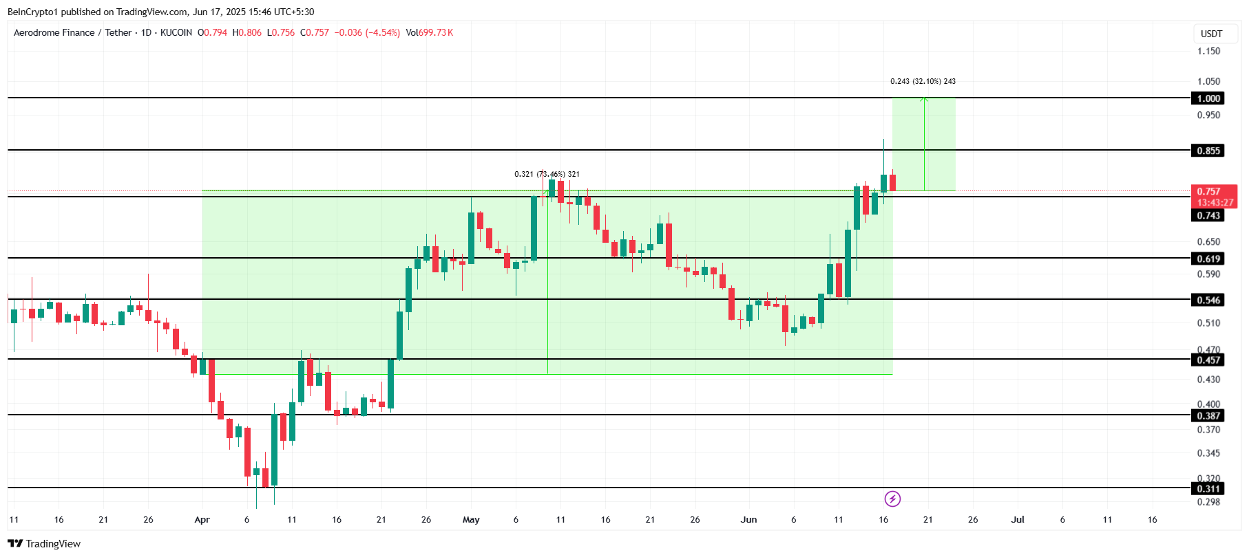 AERO үшін келесі негізгі мақсат 1,00 доллар, бұл оның ағымдағы бағасынан 32%-ға өсуін білдіреді. Coinbase-тің Base Blockchain-ді өз платформасына біріктіру туралы хабарламасы осы баға қозғалысының негізгі катализаторы болып табылады. Бұл мақсатқа жету үшін AERO 0,85 доллар деңгейін қолдау ретінде қамтамасыз етуі керек, бұл 1,00 долларға қарай одан әрі жоғары қозғалыс үшін қажетті негізді қамтамасыз етеді.