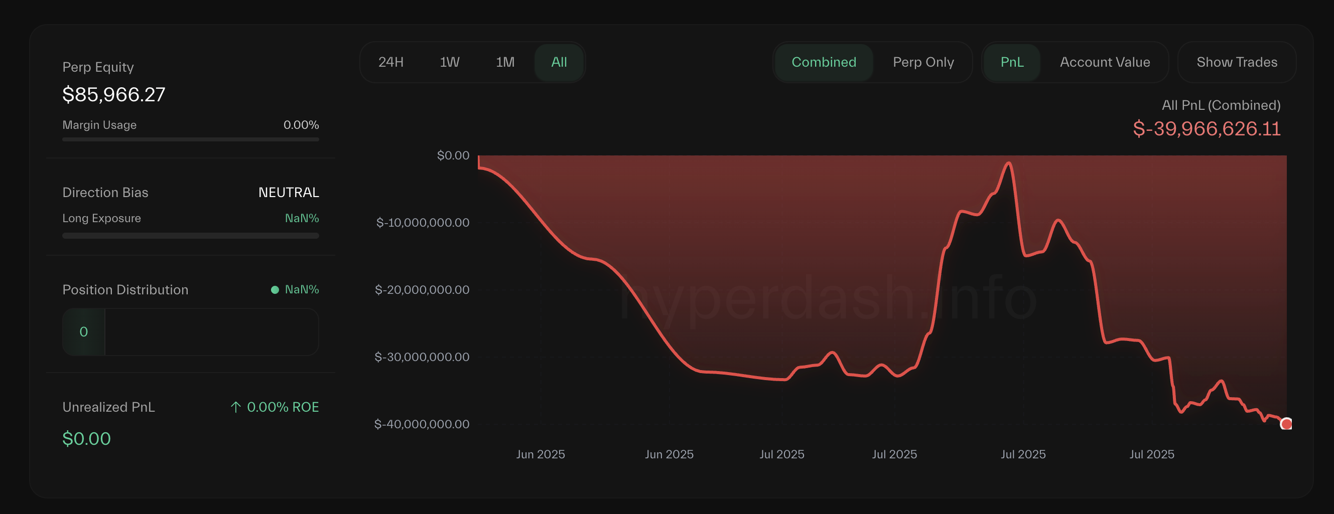 Белгілі криптовалюта трейдері AguilaTrades Hyperliquid платформасында толықтай жойылып, өзінің капиталының дерлік барлығынан айырылды. Оның шығындары қазір 40 млн долларға жақындап қалды.