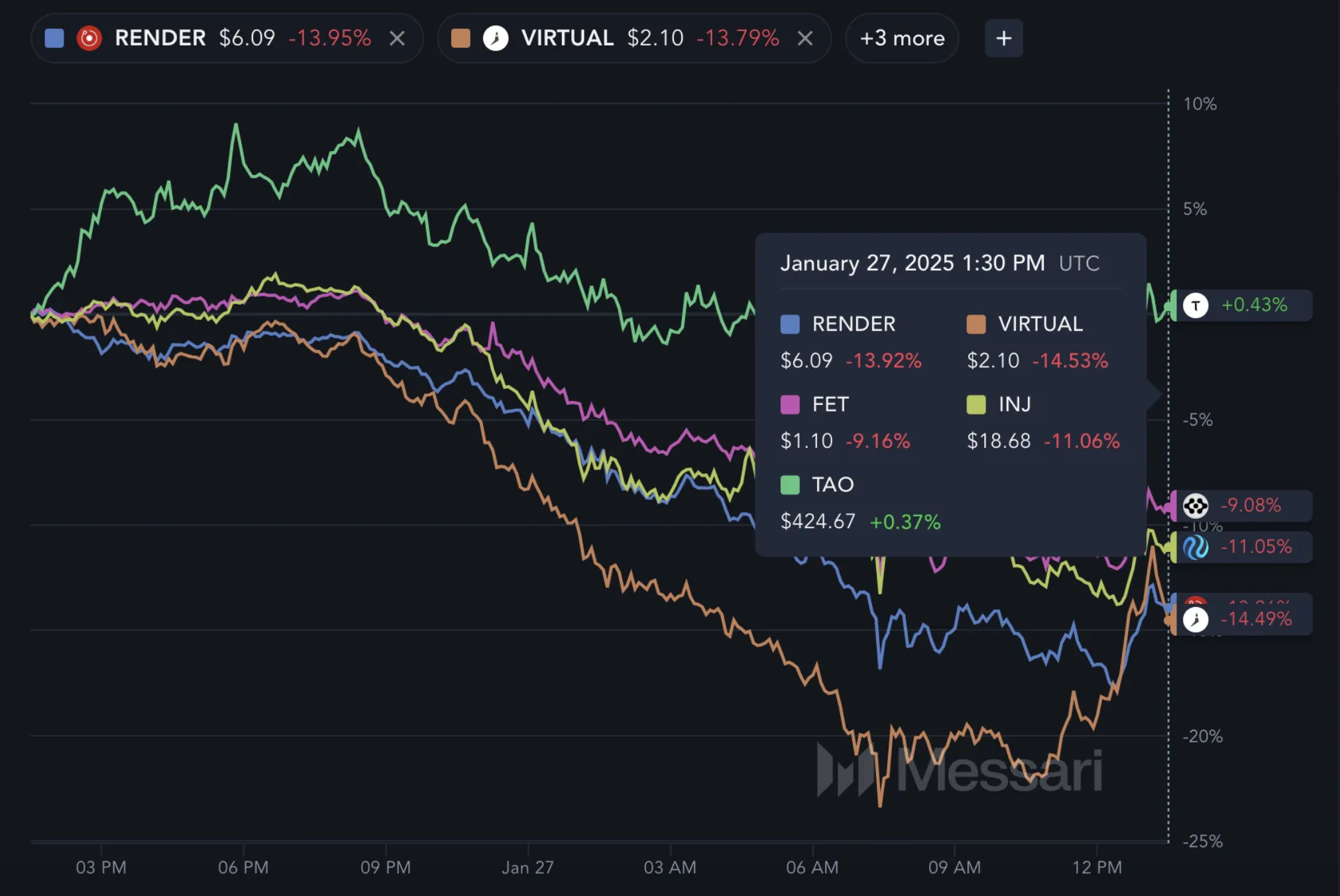 Крипто секторының DeepSeek-пен тікелей байланысы болмаса да, ол AI әзірлеушілерімен бір алаңда ойнайды. Нәтижесінде, крипто R1 іске қосылуы туралы жаңалықтардан дәл солай әсер алды.