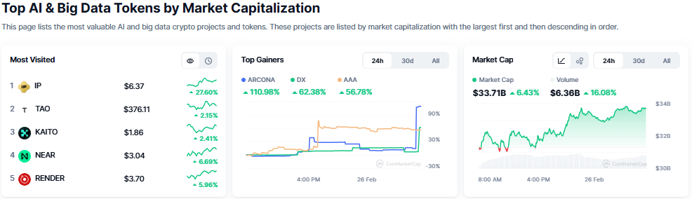 CoinGecko деректеріне сүйенсек, ЖИ крипто токендерінің бағалары өсуде. Story (IP), AI Rig Complex (ARC), Livepeer (LPT) және aixbt by Virtuals (AIXBT) сияқты кейбіреулері екі таңбалы өсім көрсетуде.