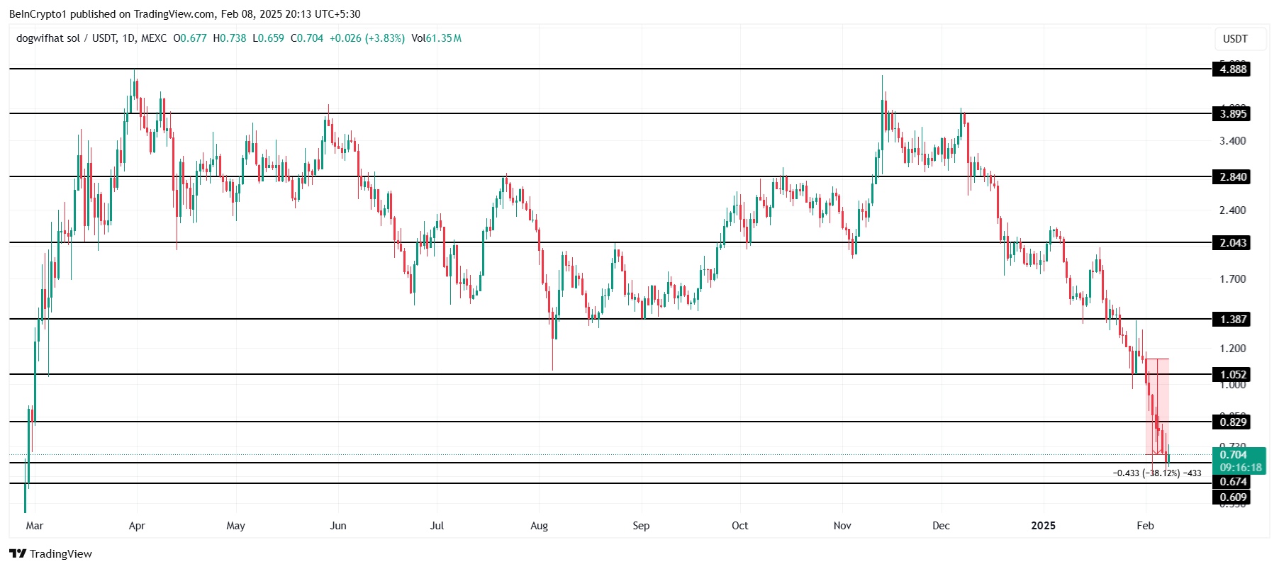 WIF бағасы осы аптада шамамен 38%-ға төмендеп, 11 айлық минимум $0,704-ке жетті. Бұл күрт төмендеу осы аптада маңызды $0,829 қолдау деңгейін жоғалтқаннан кейін болды. Бұл құлдырау аю көңіл-күйін күшейтіп, ағымдағы нарықта тұрақтылық табуға тырысқан альткоин үшін одан әрі шығындар туралы алаңдаушылықты арттырды.