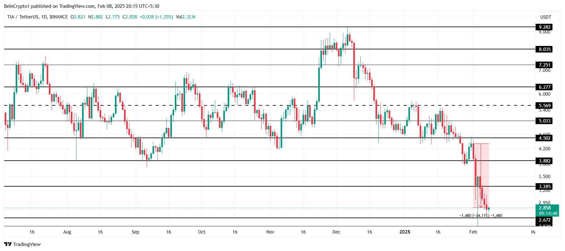 TIA осы аптада 31% күрт төмендеуді бастан кешіруде және қазіргі уақытта $2,88 деңгейінде саудалануда. Альткоин $2,67 маңызды қолдау деңгейінен жоғары тұруға тырысуда.