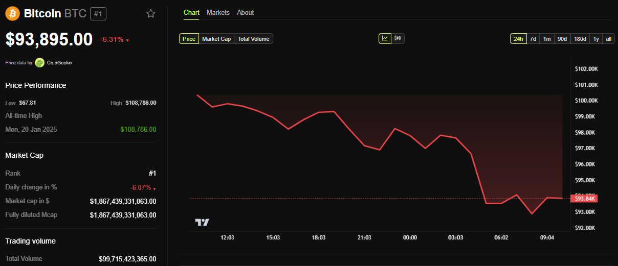 АҚШ-тың осы экономикалық деректерінің алдында BTC 93 895 доллар, дүйсенбі күнгі сессия ашылғаннан бері 6,31%-ке төмендеді.