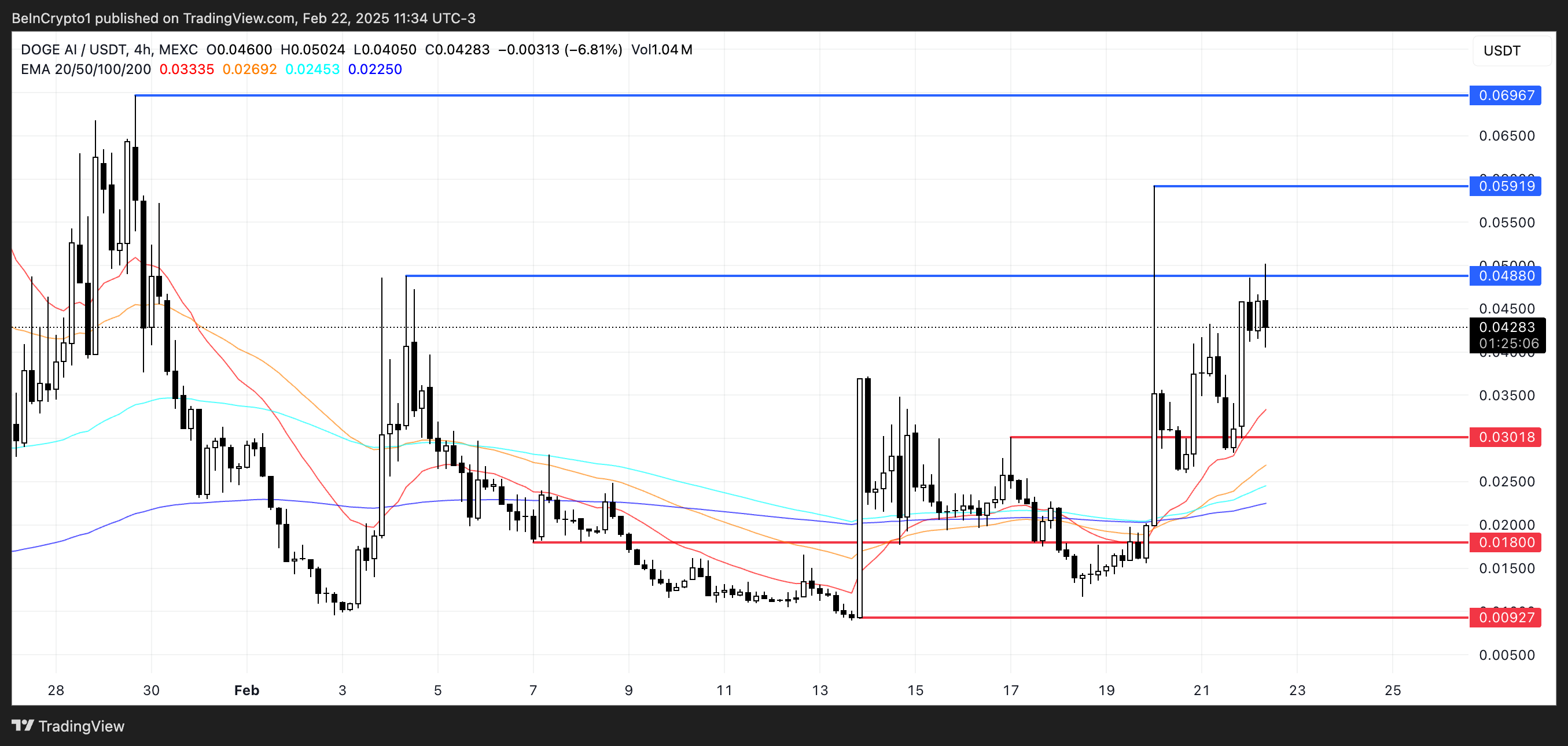 Ағымдағы өсу үрдісі жалғасса, DOGEai 0,048 долларға қарсыласуды тексеруі мүмкін, ал ықтимал мақсаттар 0,059 доллар және 0,069 доллар болуы мүмкін. Алайда, егер төмендеу үрдісі пайда болса, DOGEai 0,030 долларда қолдауға ие, және егер бұл деңгей жоғалса, ол 0,018 долларға немесе тіпті 0,0092 долларға дейін төмендеуі мүмкін.