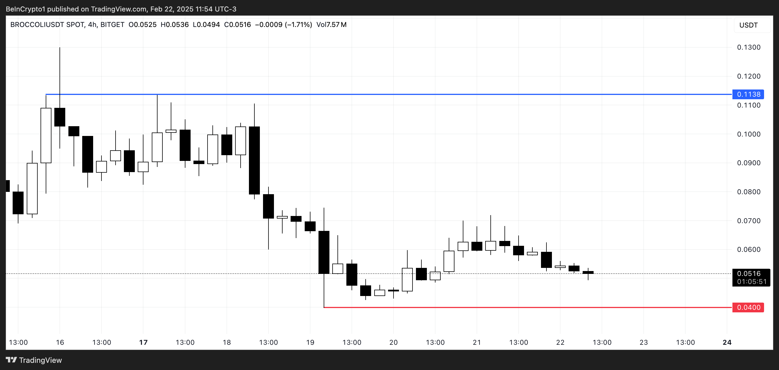 Егер төмендеу үрдісі жалғасса, BROCCOLI 0,04 доллар маңындағы қолдауды сынауы мүмкін, және бұл деңгейден төмен түссе, іске қосылғаннан бері ең төменгі бағасына дейін төмендеуі ықтимал.