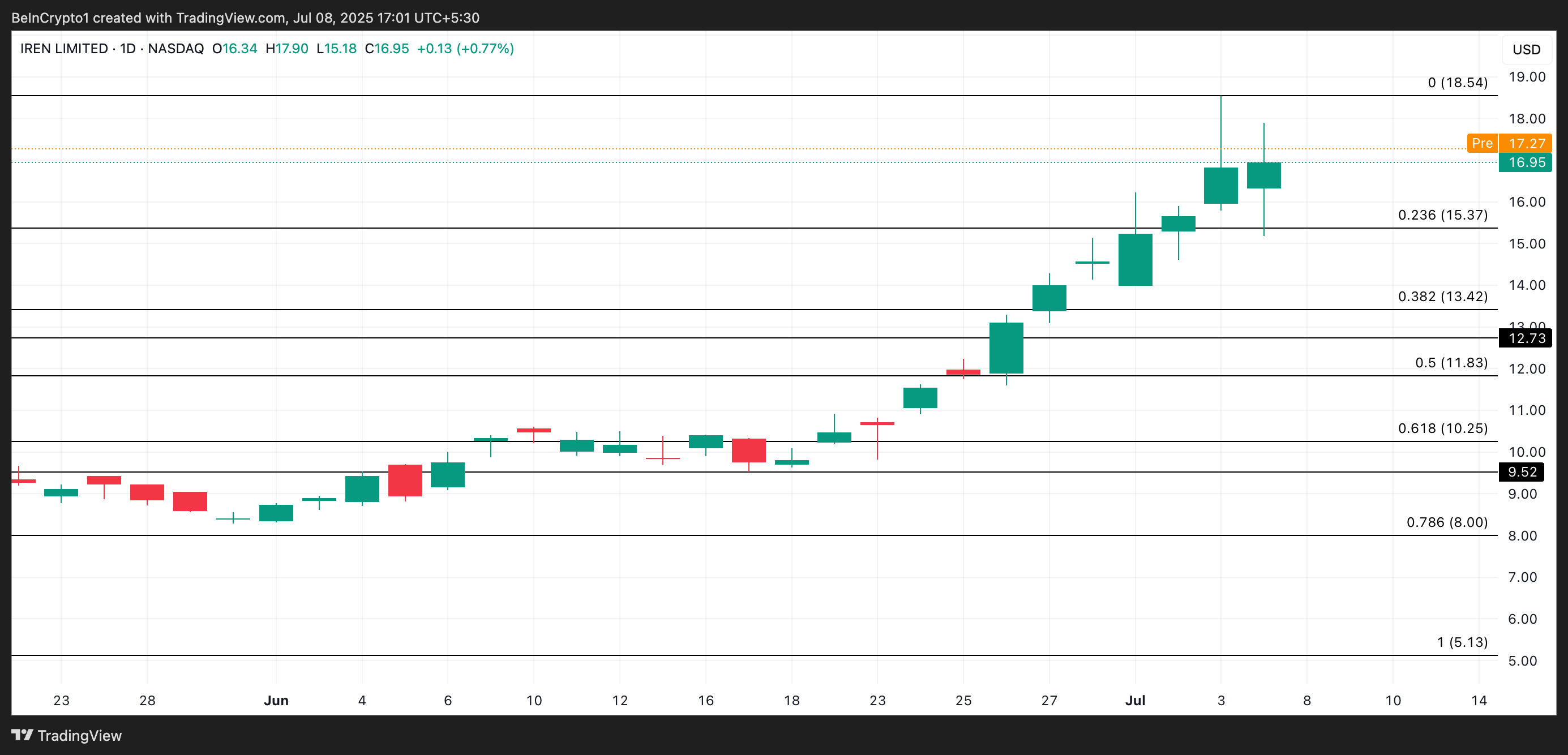 Бүгінгі нарыққа дейінгі сауда кезінде IREN акциялары 17,03 доллардан 17,39 долларға дейін өсті. Егер сатып алу нарық ашылғанда жалғасса, баға 18,54 долларға жетуі ықтимал.
