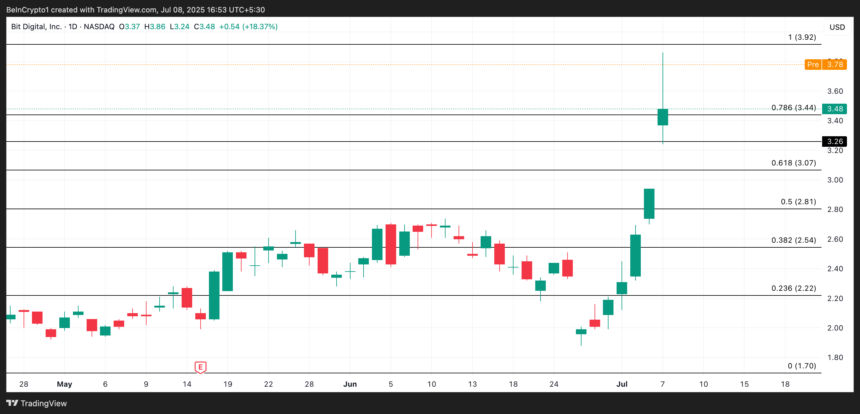BTBT бүгінгі нарыққа дейінгі сауда сессиясында 3,78 доллардан саудалануда. Егер сұраныс нарық ашылғанда өссе, акция 3,92 долларға жетуі мүмкін.
