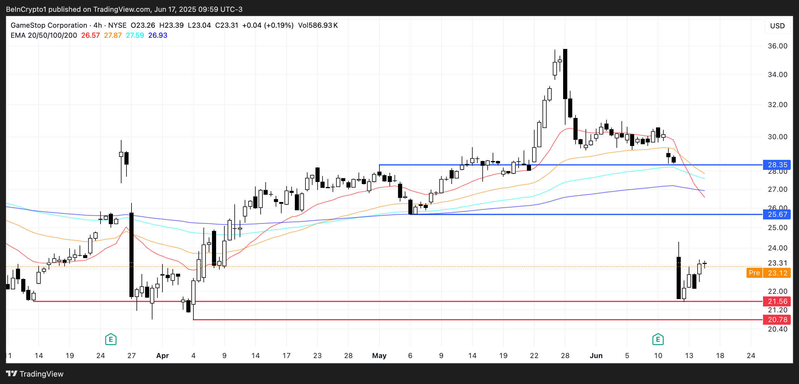Алайда, бұл серпіліс қысқа мерзімді болуы ықтимал—GME алдын ала нарықта 0,69%-ға төмендеді, және егер түзету жалғасса, баға 21,56 доллар және ықтимал 20,78 доллар деңгейіндегі негізгі қолдау деңгейлерін қайта сынауы мүмкін.