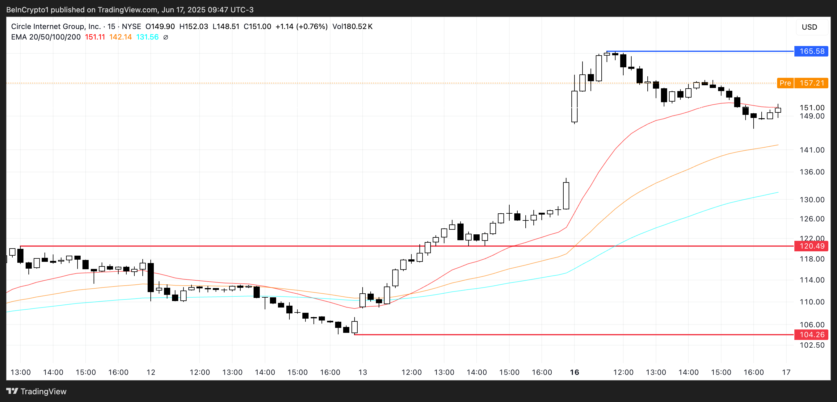 Circle’s (CRCL) акциялары NYSE-дегі дебютінен бері қарқынды өсуде, дүйсенбіде 13%-дан астамға өсіп, алдын ала саудада 4%-дан астамға өсті.