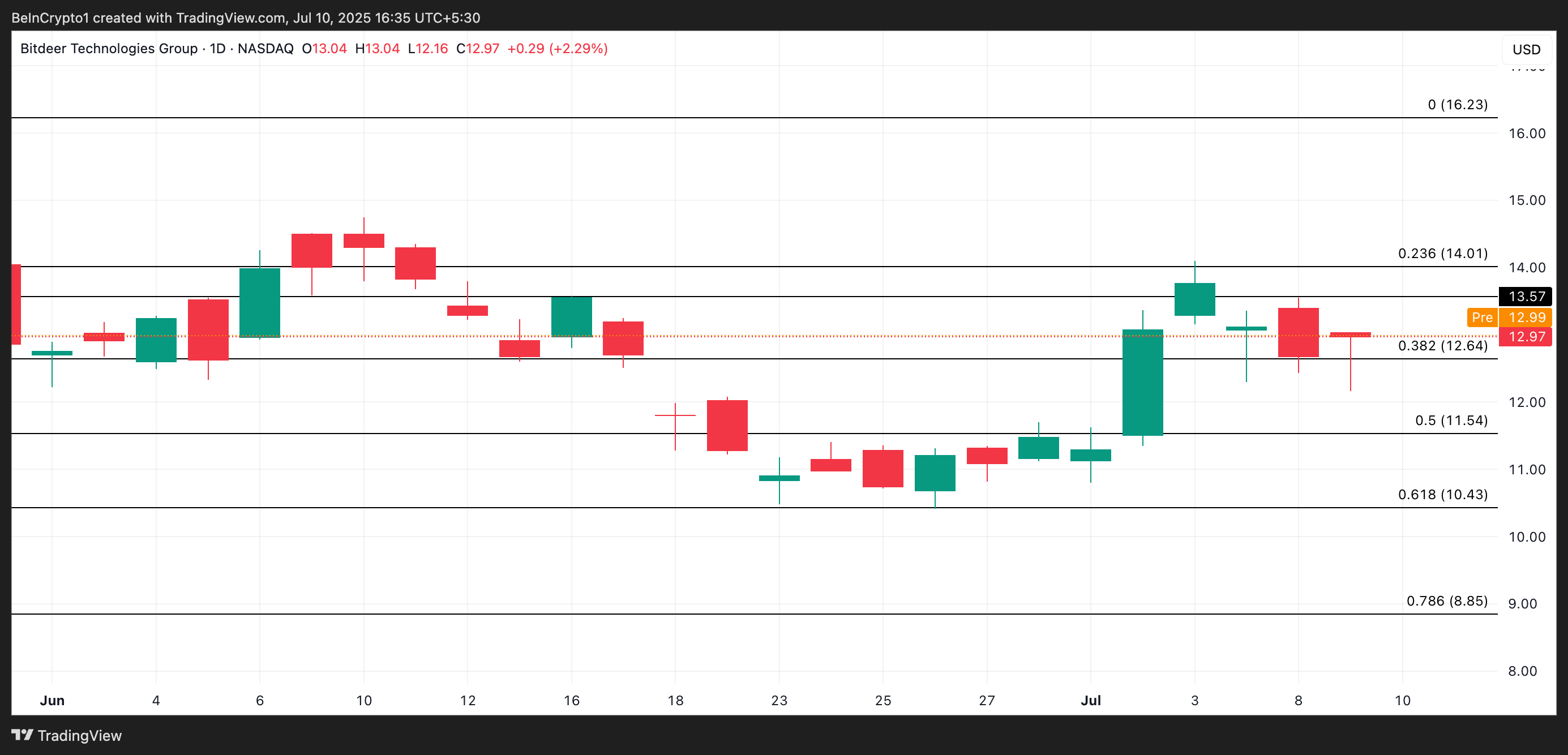 Егер сатып алу нарық ашылғанда жоғары деңгейде қалса, BTDR 13,57 доллар қарсылық деңгейіне қарай көтерілуі мүмкін. Алайда, 12,64 доллардан төмен түсу сату қысымының жаңаруын білдіреді.