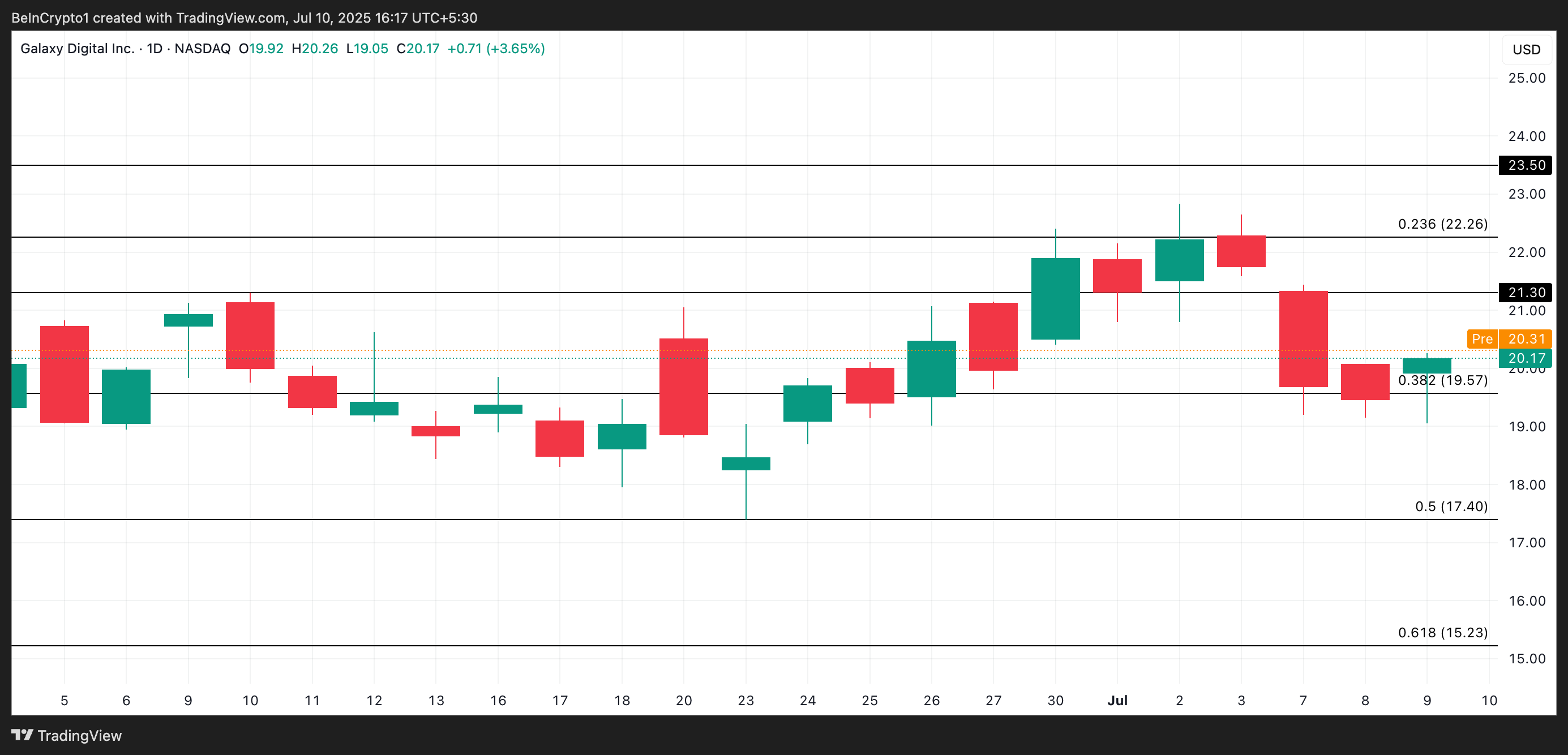 GLXY 1%-ға өсіп, 20,17 доллармен жабылды, сәрсенбі күні компанияның Fireblocks-пен ірі интеграциясын жариялауынан кейін.