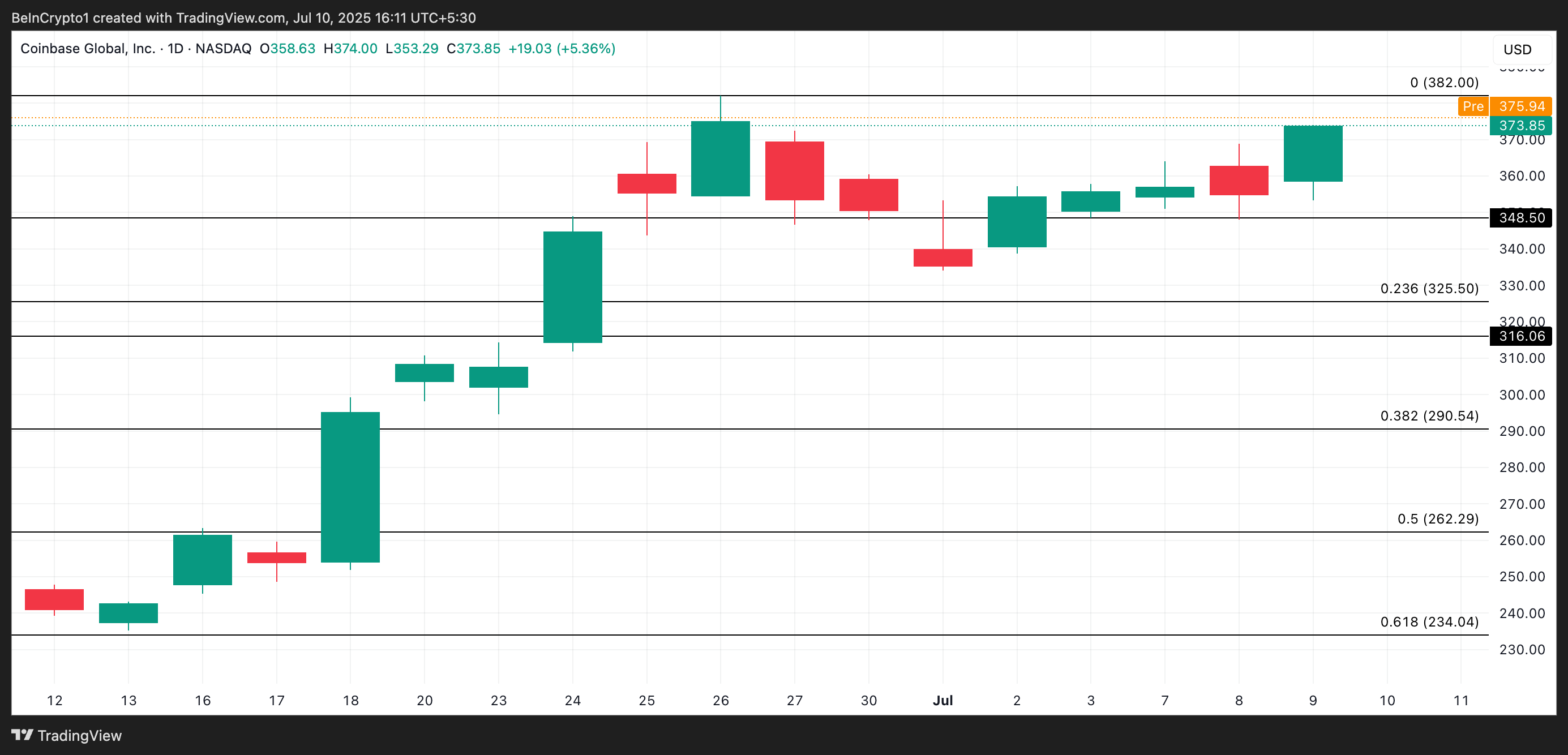 Жаңарту бұқа көңіл-күйін күшейтті, COIN бүгінгі алдын ала нарық сессиясында 375,94 доллармен саудаланып жатыр. Егер сұраныс нарық ашылғаннан кейін өсе берсе, акция 382 долларға қарай көтерілуге тырысуы мүмкін.