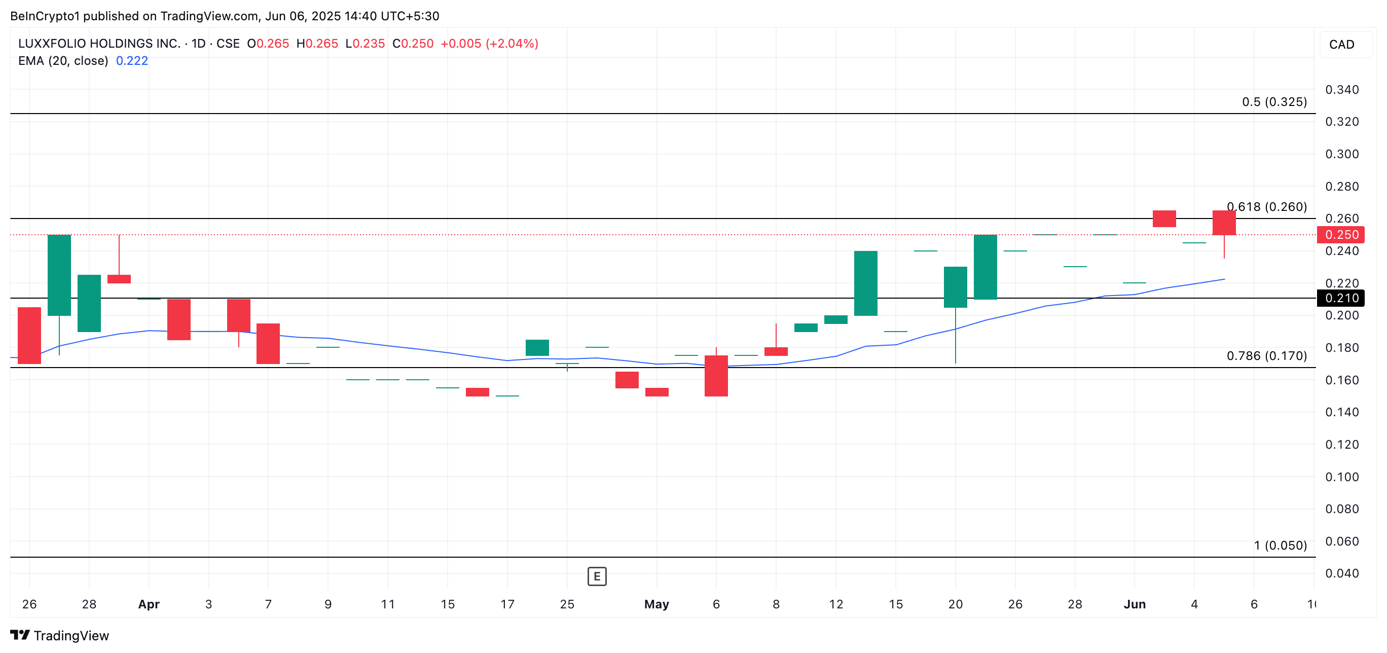 Жазу кезінде LUXFF 0,25 долларға саудаланып, 20 күндік EMA-дан жоғары деңгейде тұр. Қазіргі уақытта 0,22 долларда тұрған бұл негізгі жылжымалы орташа көрсеткіш LUXFF бағасының астында динамикалық қолдау деңгейін құрайды.