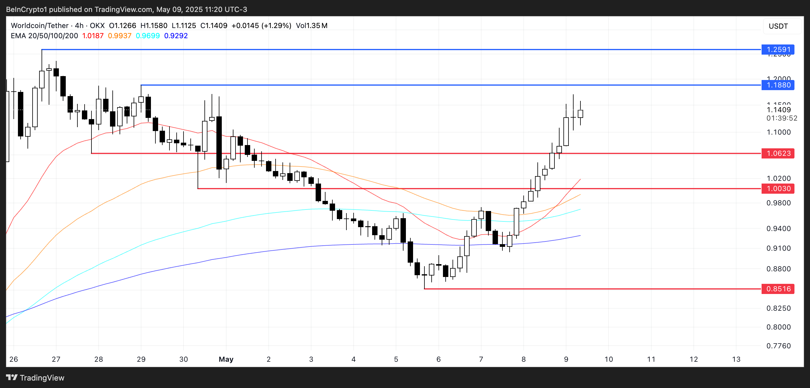 OpenAI әлеуметтік медиа платформасымен ықтимал интеграция туралы болжамдар, оның жақында Coinbase-те тізімге енгізілуімен бірге, инвесторлардың қызығушылығын одан әрі арттырды. Техникалық тұрғыдан алғанда, WLD-нің EMA сызықтары бұқа импульсін көрсетті.