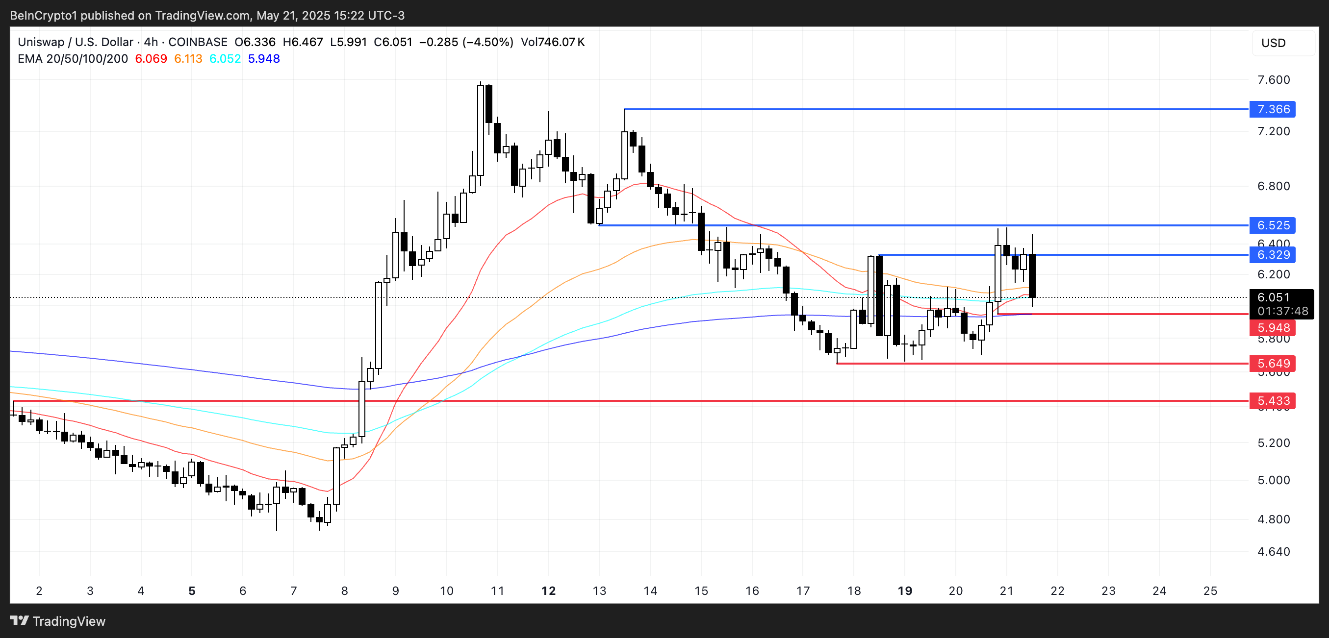 Егер бұл деңгей бұзылса, ол 5,649 долларға, тіпті 5,43 долларға дейін төмендеуі мүмкін. Керісінше, импульстің қалпына келуі UNI-ді 6,329 долларды қайта сынауға жібере алады. Егер бұл деңгей бұзылса, келесі қарсылық 6,52 және 7,36 долларда жатыр.