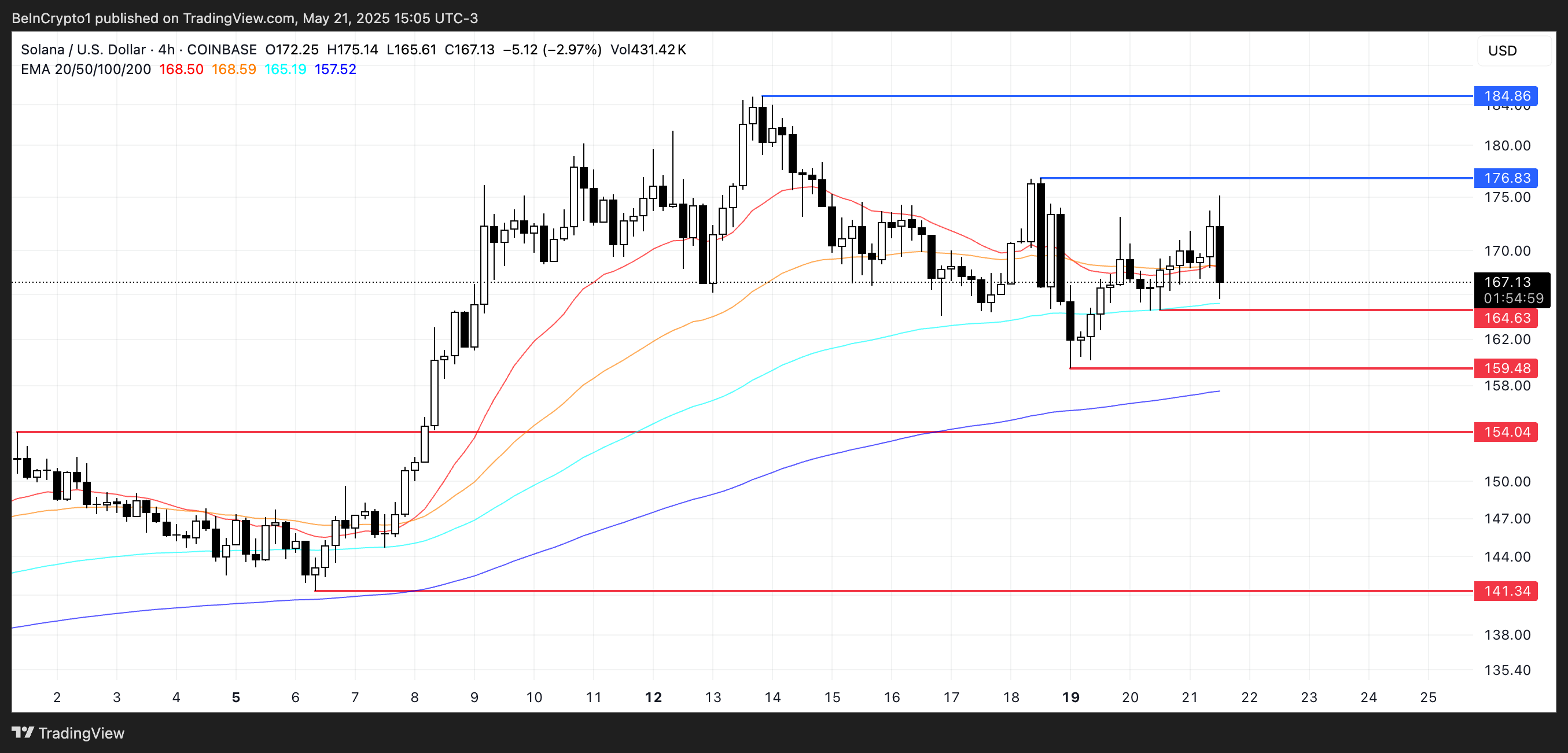 Техникалық тұрғыдан, SOL $164 деңгейінде қолдауды ұстап тұр. Егер бұл деңгей сақталса, $176,83 және $184,86 деңгейлерін сынауы мүмкін. Егер $164 деңгейі сәтсіз болса, келесі қолдау деңгейлері $159,48, $154 және $141 болады.