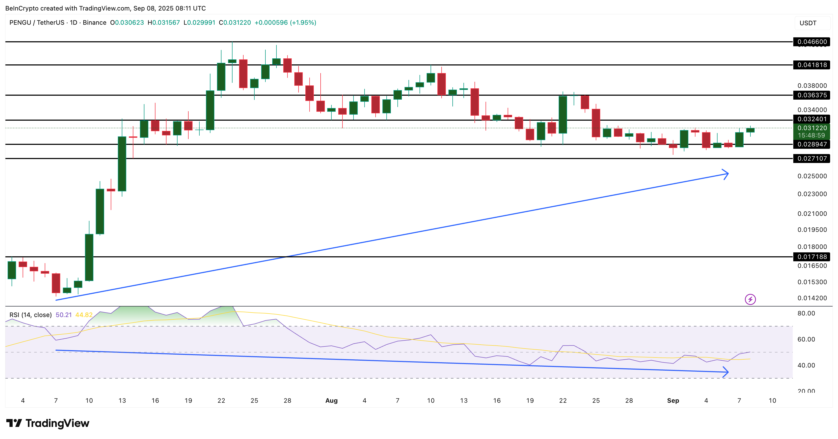 Бұл тұрғыда ең күшті белгі Салыстырмалы күш индексінен (RSI) келеді. 7 шілде мен 6 қыркүйек аралығында PENGU бағасы жоғары төменгі деңгейге жетті, ал RSI төменгі деңгейге түсті. Бұл жасырын бұқа дивергенциясы деп аталады.