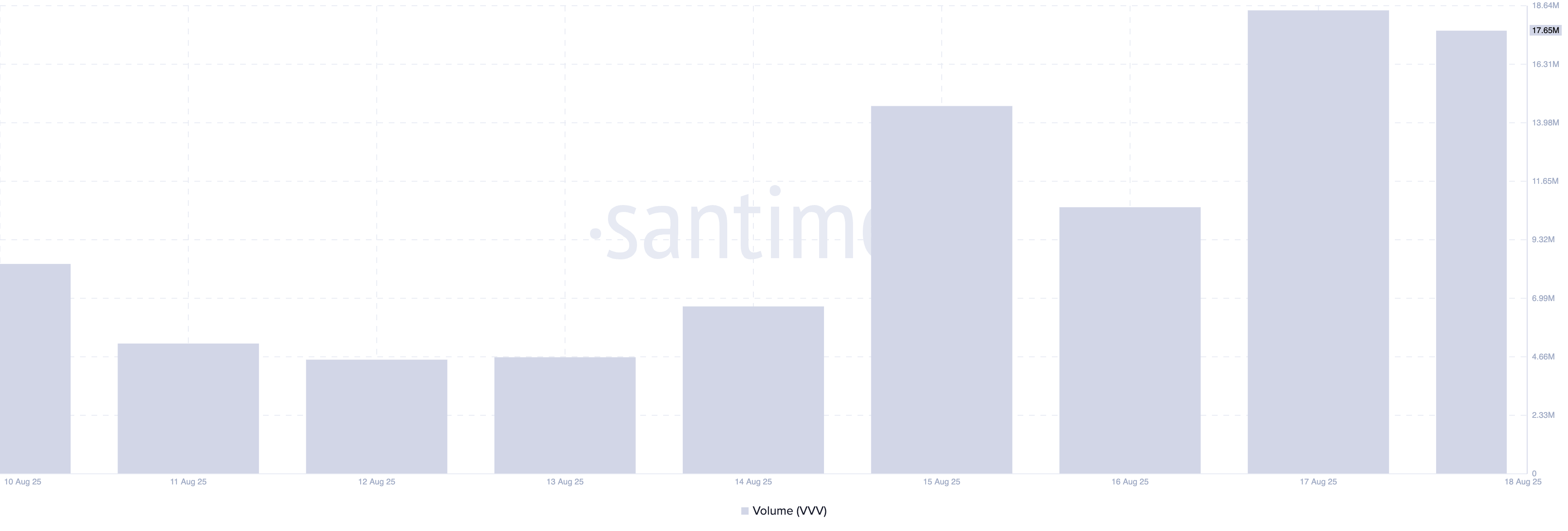 Активтің сауда көлемі бағасымен бірге өскенде, бұл баға қозғалысының шынайы нарықтық қызығушылықпен қолдау тапқанын білдіреді, жұқа өтімділікпен емес. VVV үшін бұл трейдерлердің токенді белсенді түрде сатып алып жатқанын, оның қысқа мерзімді перспективасына сенімділікті білдіреді.