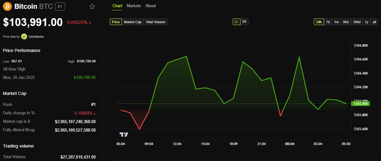 BeInCrypto деректері бойынша, осы жазу кезінде BTC 103 991 доллар үшін сатылып, соңғы 24 сағатта 0,09%-ға төмендеді.
