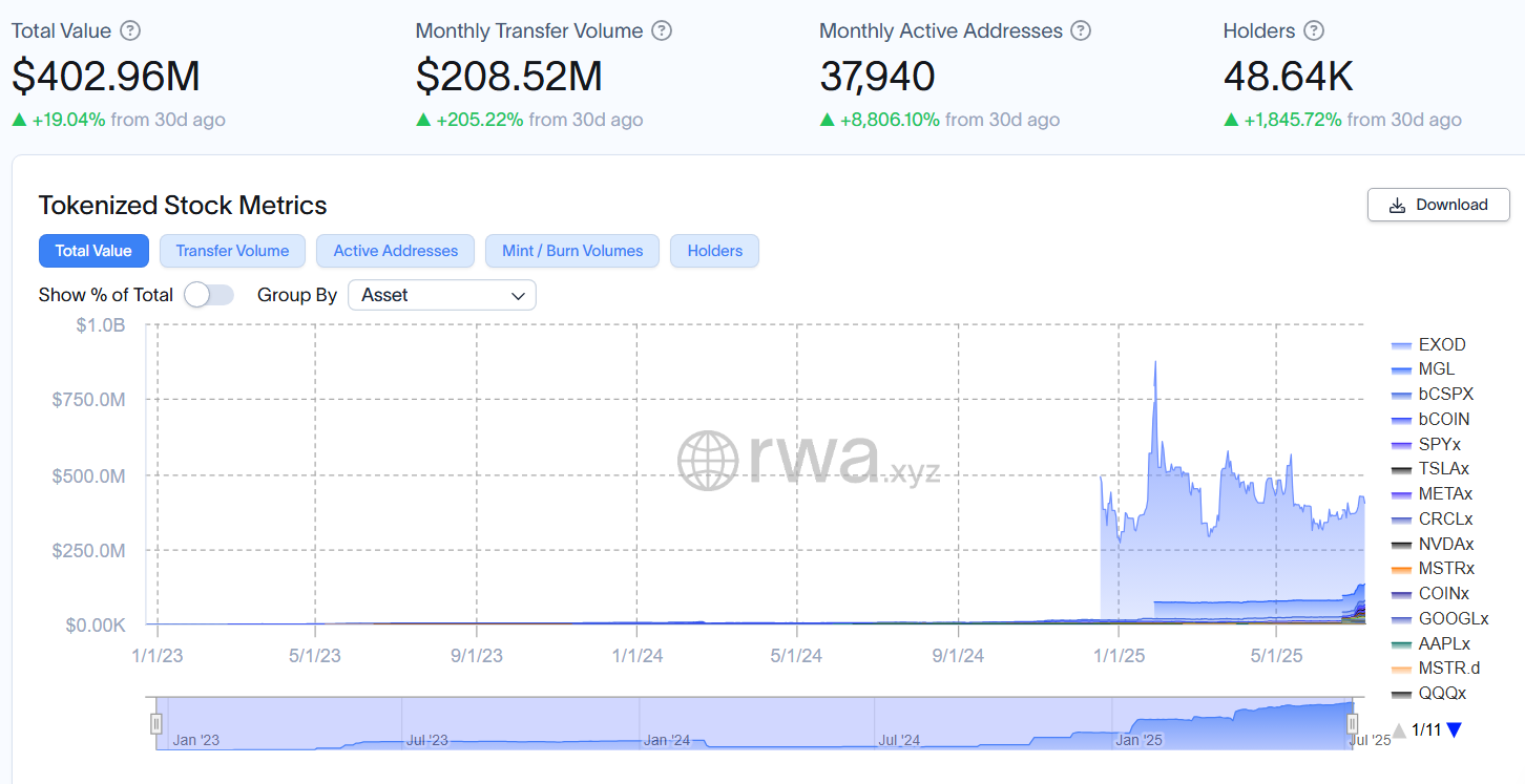 RWA.xyz деректеріне сәйкес, токенделген акциялардың нарықтық капитализациясы өткен айда 19%-ға өсіп, 400 млн доллардан асты.