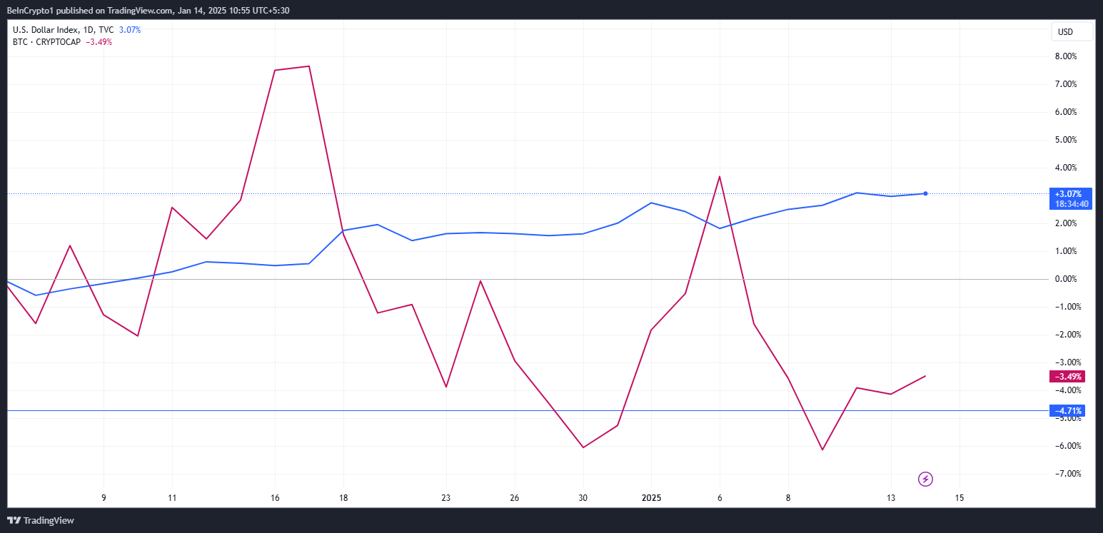 Тарихи тұрғыдан алғанда, Bitcoin-ның көрсеткіші DXY-мен кері байланыста болған, бұл цифрлық актив үшін маңызды сәт жақындап келе жатқанын болжауға итермелейді.