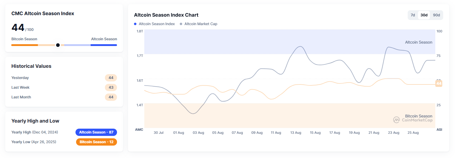 Нағыз альткоин маусымын кең нарықтық ралли анықтайды, бірақ бірнеше негізгі метрикалар бұл әлі болмағанын көрсетеді. Мысалы, CoinMarketCap Altcoin Season Index 90 күн ішінде ең үздік 100 альткоинның 75%-ы Bitcoin-нан асып түскенін өлшейді.