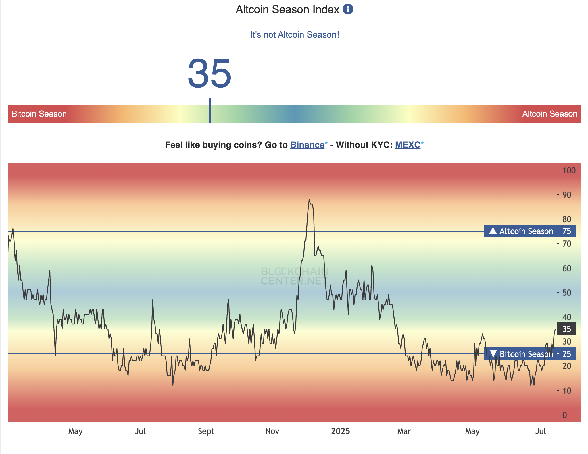 Альткоин маусымы индексі 35-ке жетті, бұл ақпан айынан бергі ең жоғары көрсеткіш. Бұл индекс бойынша ресми альткоин маусымы, егер соңғы 90 күнде үздік 50 монетаның 75%-ы биткоиннен асып түссе, басталады.