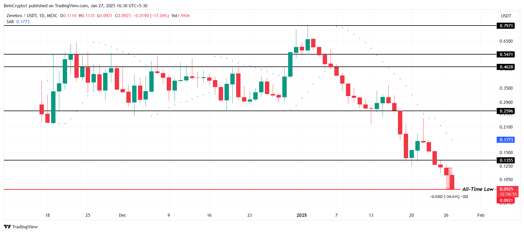 ZEREBRO бағасы соңғы 24 сағат ішінде 24%-ға төмендеп, қазір 0,0925 доллар деңгейінде саудалануда және күндізгі ең төменгі 0,0921 доллар деңгейіне жетті. Бұл күрт төмендеу аюлы көңіл-күйдің күшеюін және altcoin үшін дереу сатып алу қолдауының жоқтығын көрсетеді.
