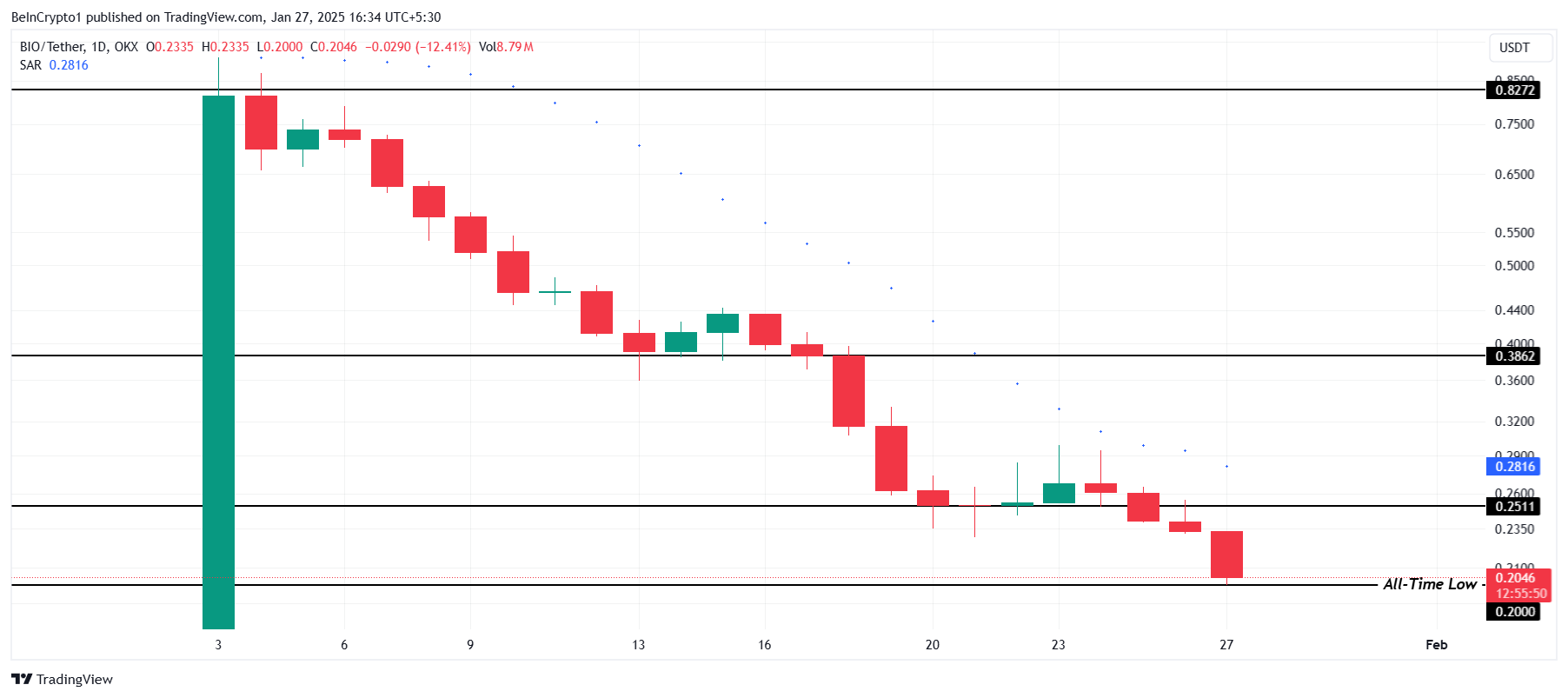 BIO бүгін 12%-ға төмендеп, бір ай бұрынғы бастапқы листингтен бері төмендеу үрдісін жалғастыруда. Бұл тұрақты төмендеу инвесторлардың сенімінің әлсіздігін көрсетеді, нарық жағдайларының қиындығымен күшейтілген.