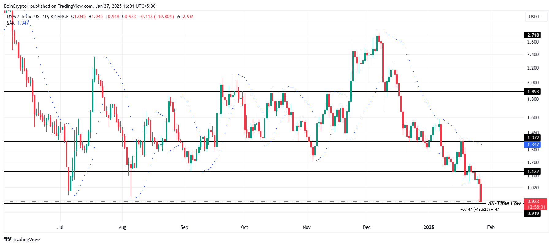 DYM соңғы 24 сағат ішінде 13,6%-ға төмендеп, бүгінгі күндізгі сауда кезінде жаңа тарихи минимум 0,91 доллар деңгейіне жетті. Бұл төмендеу altcoin-ның 1,13 доллар қолдау деңгейін ұстап тұра алмауынан кейін орын алды, бұл оның ағымдағы аюлы нарық жағдайында күресіп жатқанын одан әрі көрсетеді.