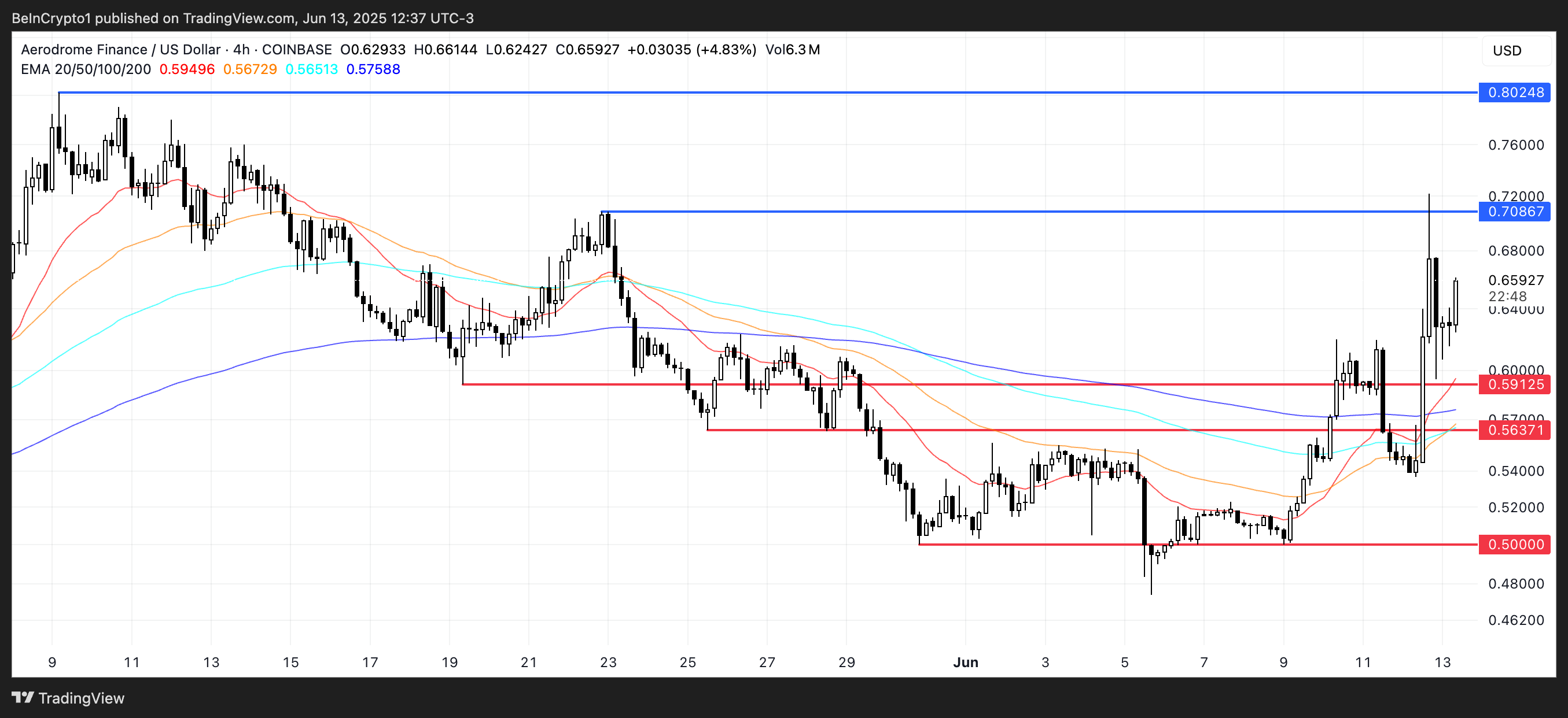 Алдағы уақытта, AERO-ның техникалық орнатылымы 0,708 доллардағы негізгі қарсылыққа жақындап келеді—егер ол бұзылса, ол тез арада 0,80 доллар деңгейіне көтерілуі мүмкін. Төменгі жағында, ең жақын қолдау 0,591 долларда орналасқан, ал егер ол деңгейден төмен түссе, AERO 0,563 долларға немесе тіпті 0,50 долларға дейін төмендеуі мүмкін.