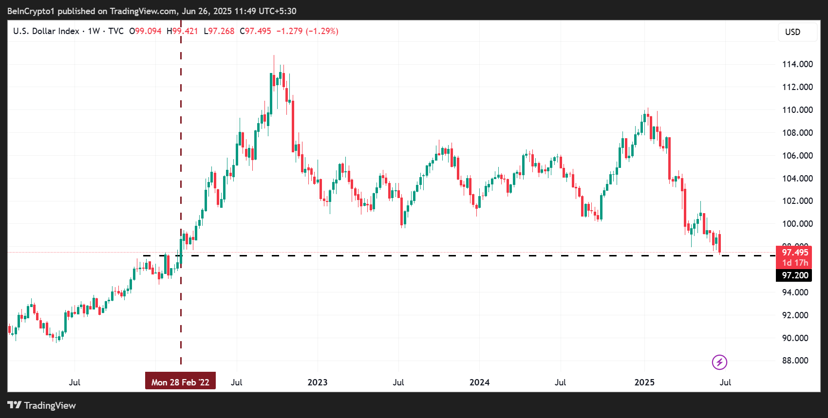 АҚШ долларының индексі (DXY) бейсенбі күні 97,2-ге дейін төмендеп, 2022 жылдан бергі ең төменгі деңгейін көрсетті. Бұл Bitcoin (BTC) және криптоға капитал ағынының үлкен өзгерісін күтуге нарықтың үмітін күшейтті.
