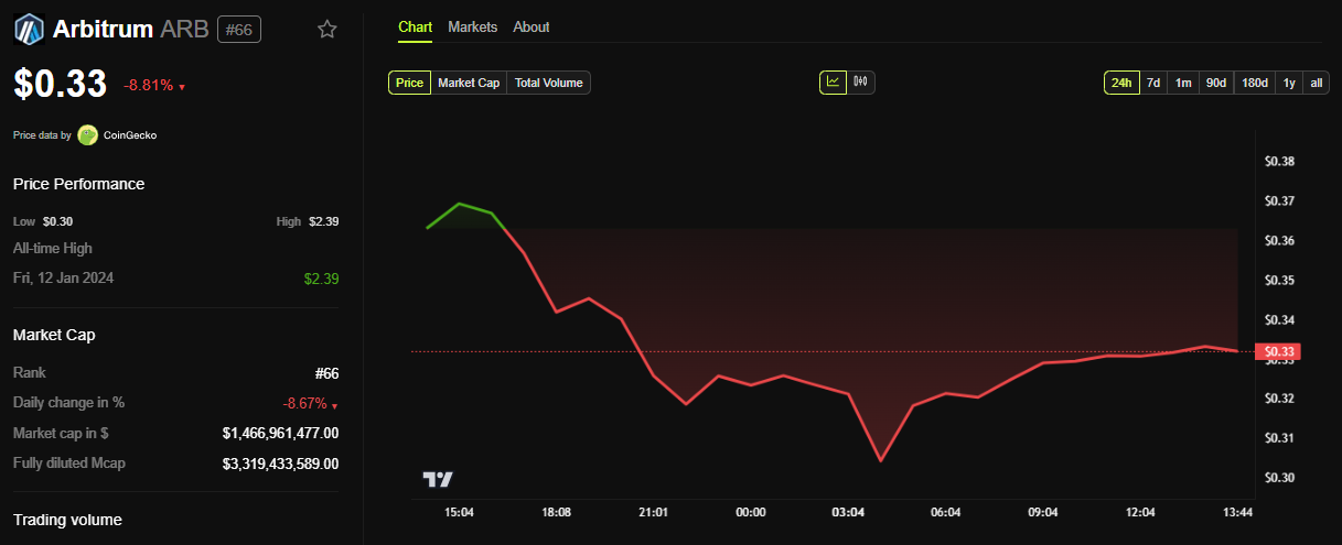 BeInCrypto мәліметтері бойынша, ARB 0,33 доллардан сатылып, сейсенбі сессиясы ашылғаннан бері шамамен 9%-ға төмендеді.