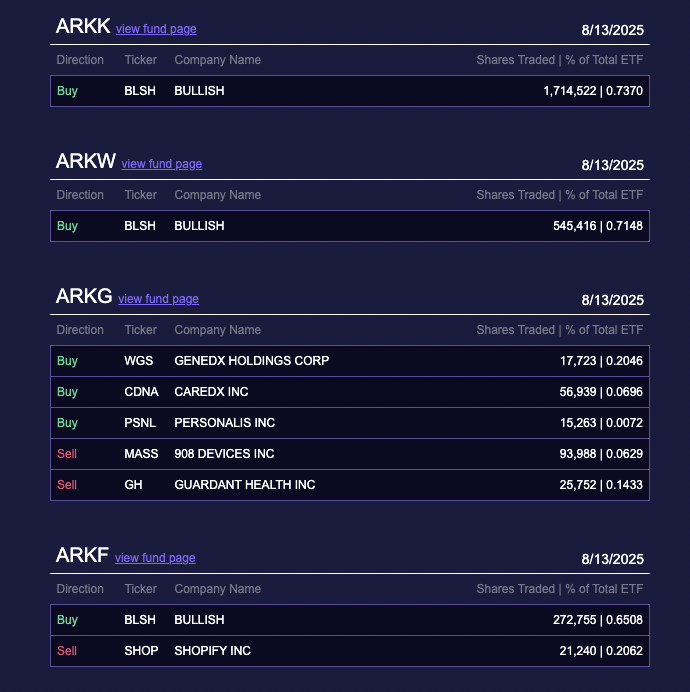Бұл сатып алу Bullish-тің акциясының жабылу бағасы 68 доллар болғанда шамамен 172,2 млн долларға бағаланды. BLSH-тен басқа, Ark Invest GeneDx Holdings Corp, CareDx Inc және Personalis акцияларын да сатып алды.