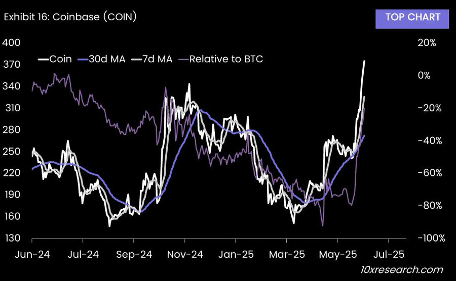 Coinbase акциялары жаңа тарихи максимумға жетіп, бұқа көңіл-күйі мен криптоға байланысты акцияларға институционалдық қызығушылықтың артуымен байланысты бұл шешім қабылданды.
